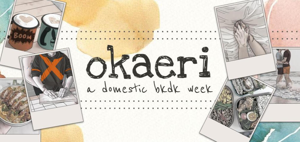 Okaeri is a fanweek dedicated to the more domestic side of daily life for Katsuki and Izuku.The event runs from 21 - 27 August 2023. During this week, there will be a selection of 2 daily word prompts and 1 quote prompt for you to choose from. All types of contributions are welcome (fics, threads, art etc.). The event will be run mainly via Twitter, but you are free to host your work on whatever platform you prefer.There are no applications needed to contribute as this is a fanweek. It's open to everyone who wish to participate.We're looking forward to seeing your takes on Izuku and Katsuki's domestic life together. If you have questions or suggestions, we invite you to talk to us via our Twitter or CuriousCat pages in the links below.